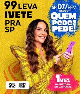 Será a primeira vez na história que Ivete Sangalo se apresenta gratuitamente em um trio elétrico no pré-Carnaval da capital paulista. Além da apresentação da cantora, marca promete entregar participações especiais nos blocos de São Paulo e Rio de Janeiro. Em Salvador, marca patrocina o tradicional Bloco Coruja. As ações fazem parte da campanha “O Brasil pede mais que um app. O Brasil pede 99”