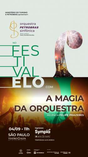 Serão três concertos inéditos sob a regência do maestro Felipe Prazeres, com ColdPlay Sinfônico, dia 03/09 às 20h; A Magia da Orquestra, com as músicas da Disney para o público infantil, dia 04/09 às 11h e ainda a cantora Roberta Sá, dia 04/09 às 18 h, como convidada.