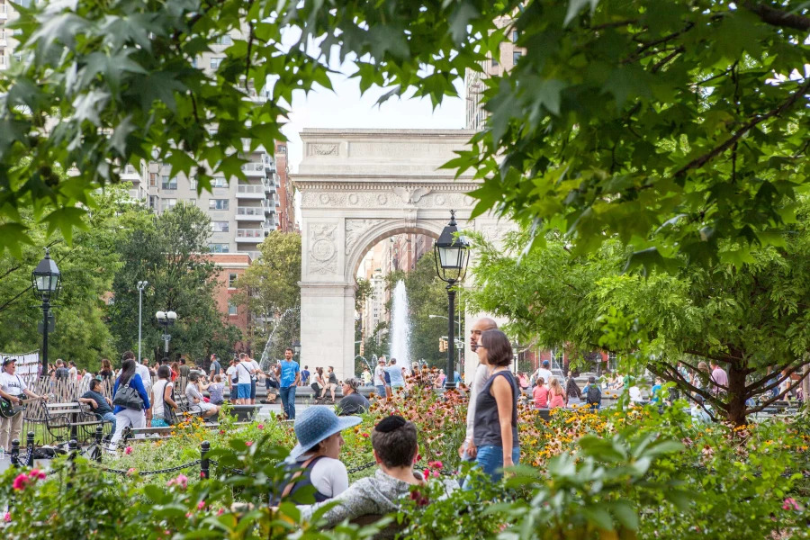 e o belo jardim que, na primavera, se exibe em seu auge, o Washington Square Park, no coração de Greenwich Village, é um convite ao relax e ao people-watching, juntando de moradores e turistas buscando se refestelar ao sol a estudantes da Universidade de Nova York, que fica ali pertinho, e músicos amadores dedilhando seus violões.