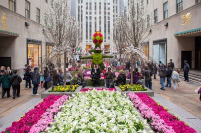 A época da Páscoa – e da primavera, claro – significa uma invasão de flores brancas e rosas no Rockfeller Center, na foto de capa desta reportagem, cuja praça também ganha de enfeite um grande coelho “esculpido” em topiaria (arte de podar plantas em formas ornamentais).
