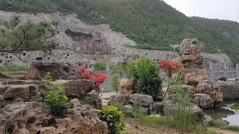 As Grutas de Longmen encontram-se por entre duas montanhas, separadas pelo rio Yishui, a 13 quilômetros ao sul da cidade de Luoyang. Compõem-se de cerca de 2 345 grutas que se estendem por um quilômetro, com mais de 100.000 estátuas de budas. A larga escala de construção demorou quase 150 anos nos períodos da dinastia Wei do Norte e da dinastia Tang (618-907). Mais de 30% das grutas foram escavadas no período da Wei, 60% na dinastia Tang e 10% em dinastias posteriores.