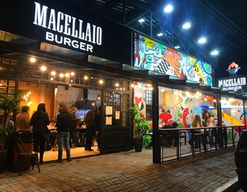 Contrapondo ao ambiente claro e bem iluminado do açougue, o da Macellaio Burger é moderno, com uma decoração industrial aparente, com vigas, iluminação indireta e intervenções artísticas da artista plástica Tiana Lago, de Salvador.