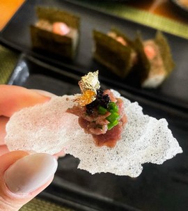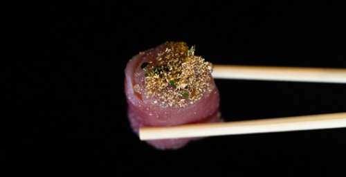 O prato é feito no capricho e o ouro utilizado traz requinte para a culinária japonesa.