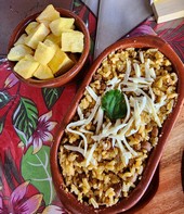 – Baião de Dois Vegetariano , com arroz, feijão de corda, queijo coalho, legumes, banana da terra e mandioca.