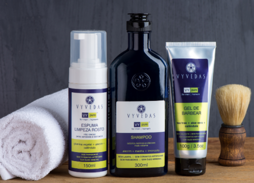 A Espuma Masculina Vyvedas Pure Homem, que promove limpeza e frescor com ingredientes naturais, adstringentes e selecionados como alecrim e menta, também pode ser adquirida individualmente.